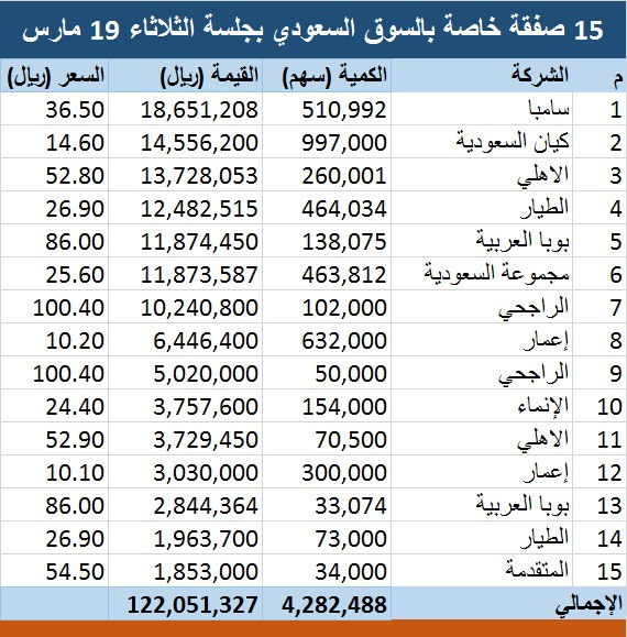 وكانت أكبر الصفقات من حيث القيم، على سهم "سامبا"، بقيمة بلغت 18.65 مليون ريال، وتم تنفيذ الصفقة عند سعر 36.50 ريال.